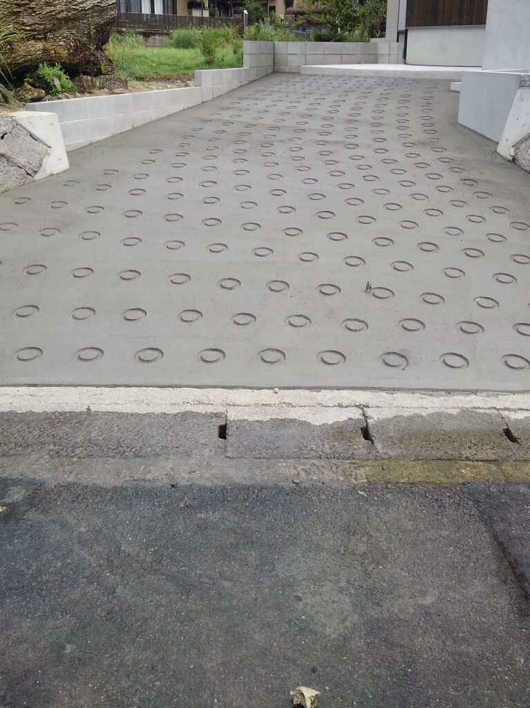 兵庫県姫路市にて、戸建て住宅の玄関前スロープ(約60㎡)をコンクリート仕上げで施工しました。冬期は積雪のある地域のため、転倒リスクを抑える目的でコートブラシによる刷毛引きを採用し、滑り止め効果を最大限に強める仕上げで対応。